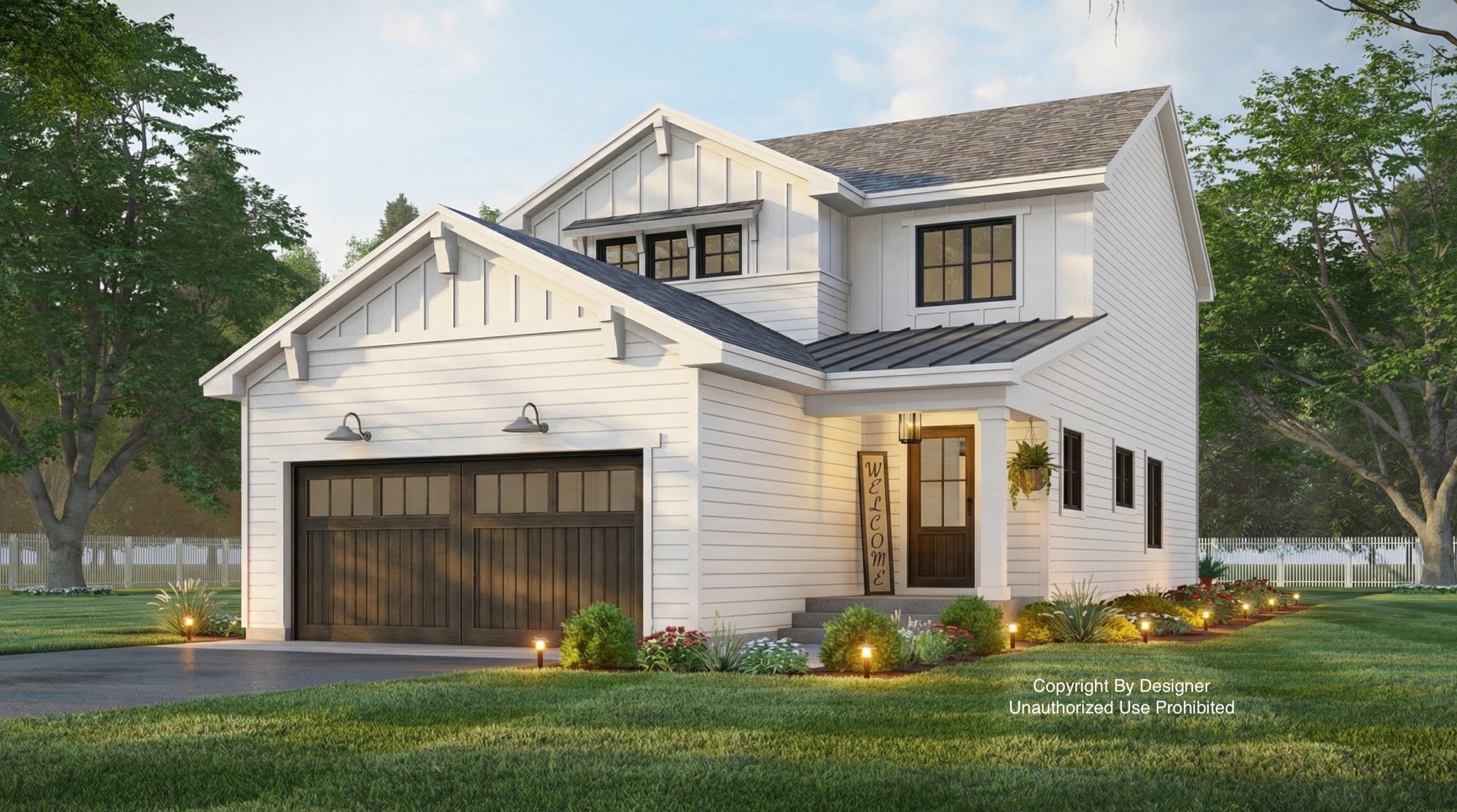 This charming 1,978 sq ft farmhouse design offers a captivating exterior and a thoughtfully designed floor plan perfect for modern living. As you enter, a welcoming foyer greets you, leading to clear sightlines from the front of the house to the rear. The main level features a spacious primary suite, providing privacy and convenience, along with a well-appointed kitchen that boasts an island with seating for four, seamlessly connecting to the adjacent dining area. The family room, located just beyond the kitchen, offers ample space for relaxation and provides access to the backyard, making it ideal for entertaining or everyday family living. Completing the main level is a convenient laundry room.
