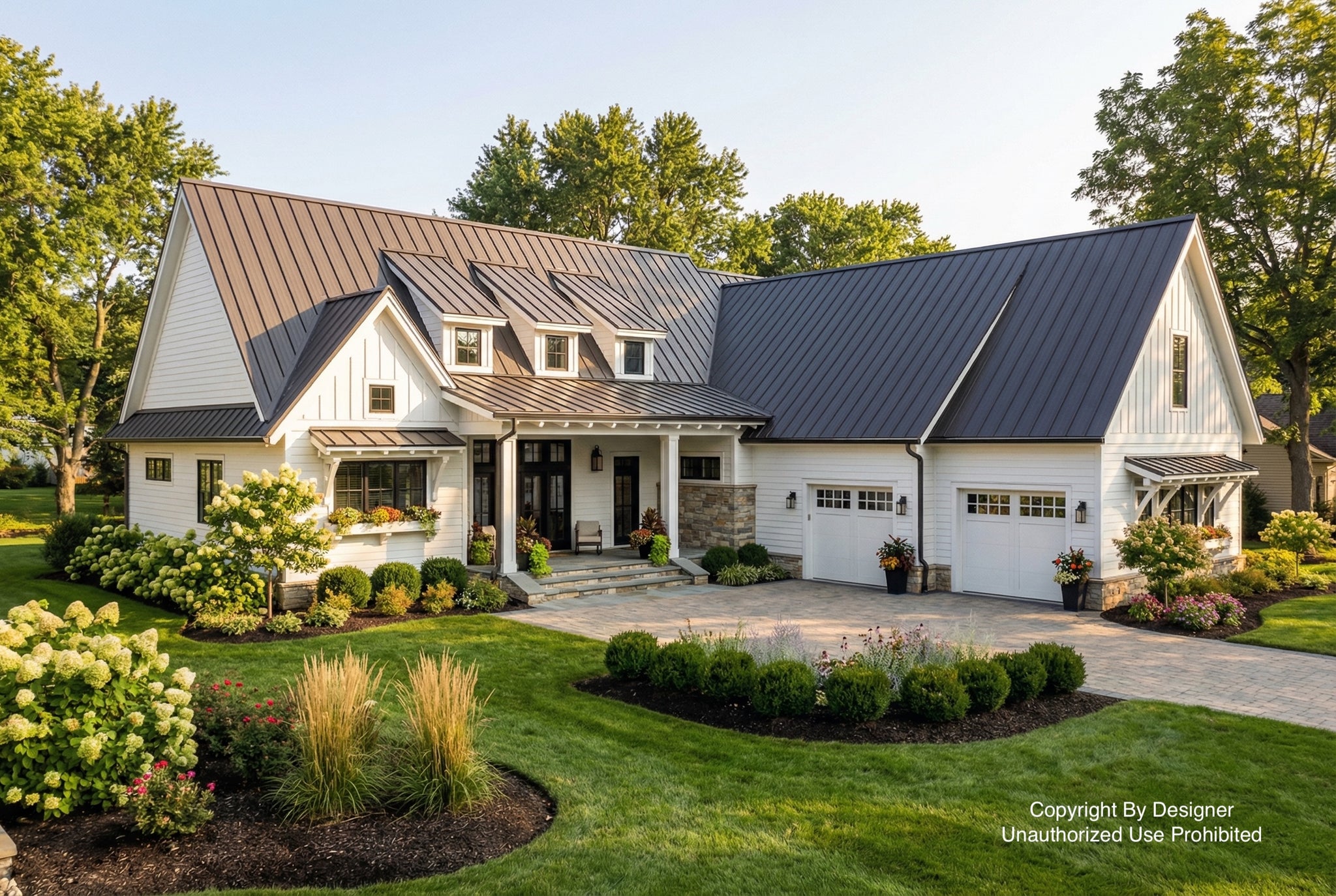 With a great combination of stone and siding, plus the decorative shed dormers, this 2340 sq ft Modern Farmhouse has tons of curb appeal! This one-story home plan has 3 bedrooms plus an optional 481 sq ft bonus room, 2 full bathrooms, a ¾ bathroom and a 2-car garage.