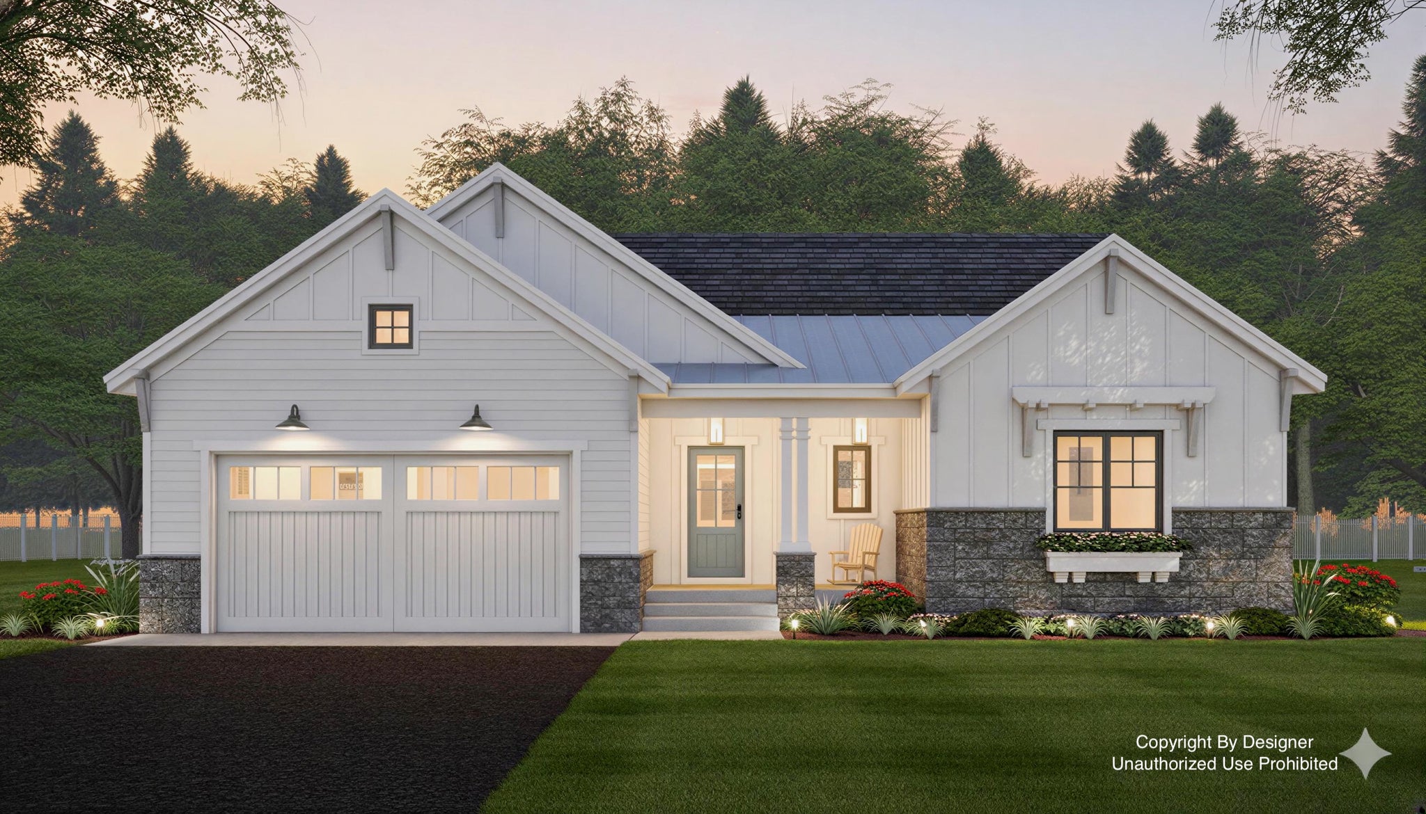 This delightful modern bungalow blends contemporary design with timeless charm, offering 1,701 square feet of comfortable living space. The home includes three generously sized bedrooms, two full bathrooms, and a handy half bathroom, making it ideal for both families and those who enjoy entertaining. The exterior boasts classic appeal with a welcoming front porch, elegant gable details, and clean architectural lines. Inside, the open-concept layout creates a harmonious flow between the spacious great room, dining area, and an efficiently designed kitchen, perfect for gatherings or daily living. A practical mudroom connects the two-car garage to the main living areas for added convenience. Standout features include a serene primary suite with a walk-in closet, a cozy grill porch for outdoor cooking, and a rear porch ideal for relaxing in the fresh air. Combining functionality with bungalow-style sophistication, this home is truly captivating.