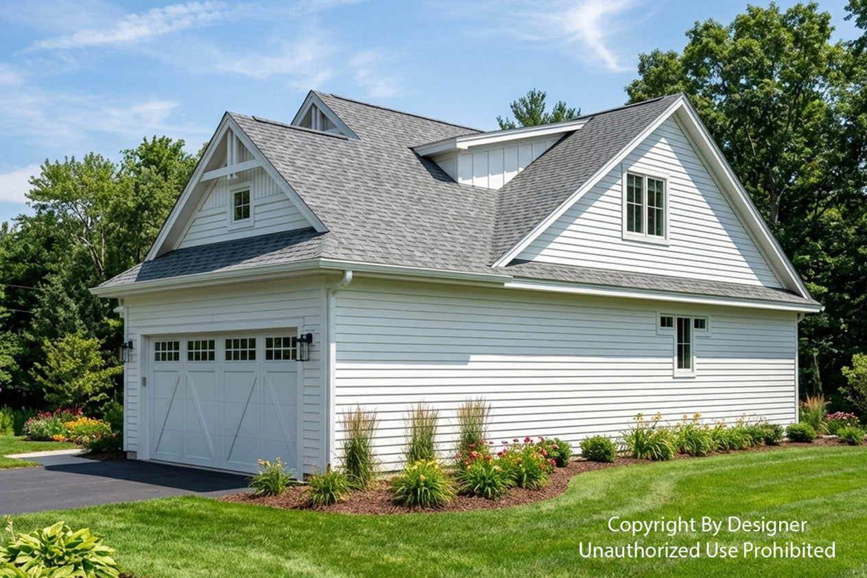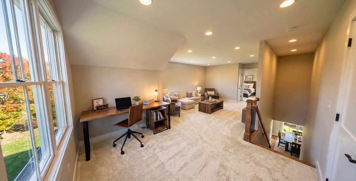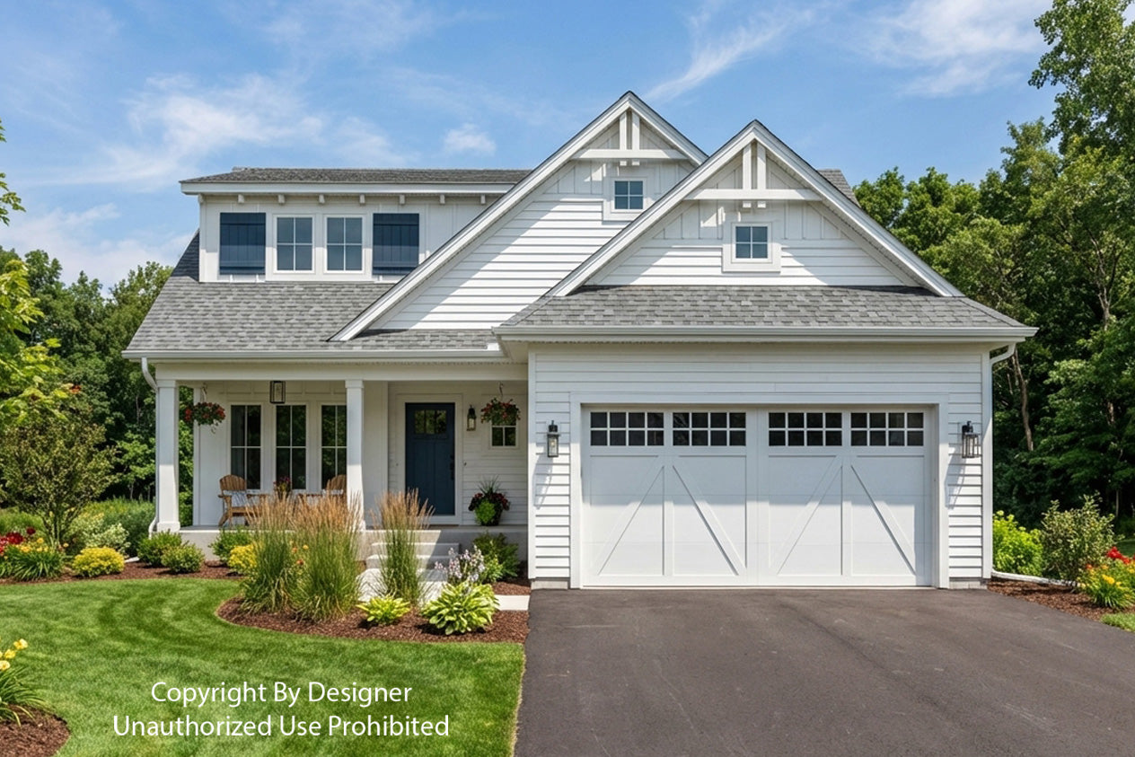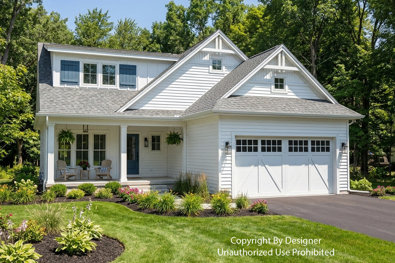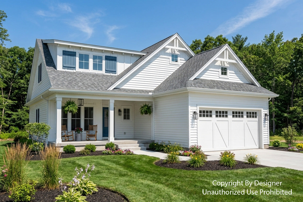 This charming Modern Farmhouse offers 2,126 square feet of thoughtfully designed living space, blending timeless curb appeal with a functional two-story layout. The exterior makes a striking first impression with crisp white horizontal lap and vertical board-and-batten siding, accented by decorative gabled rooflines and a welcoming 8x20 front porch. Inside, the main level features airy 9' ceilings and an open-concept heart comprising a family room with a cozy fireplace, a dedicated dining area, and a gourmet kitchen centered around a 3'-6" x 7' island and a walk-in pantry. Practicality meets style with a private home office near the foyer and a functional laundry-mudroom transition located just off the spacious two-car garage. The main-floor primary suite serves as a serene retreat, complete with a generous walk-in closet and private bath. Upstairs, 8' ceilings crown a versatile second level that includes two additional bedrooms, a shared full bath, and an expansive loft perfect for a media room. With an abundance of dedicated mechanical storage and a rear patio for outdoor enjoyment, this home masterfully balances stylish architectural character with the everyday needs of the modern homeowner.