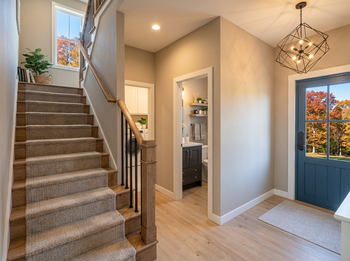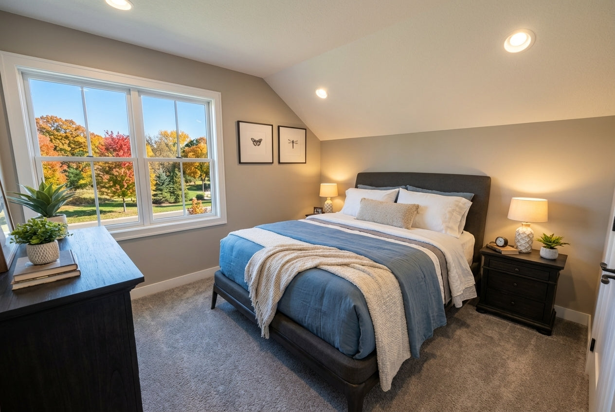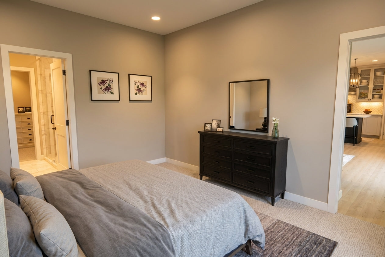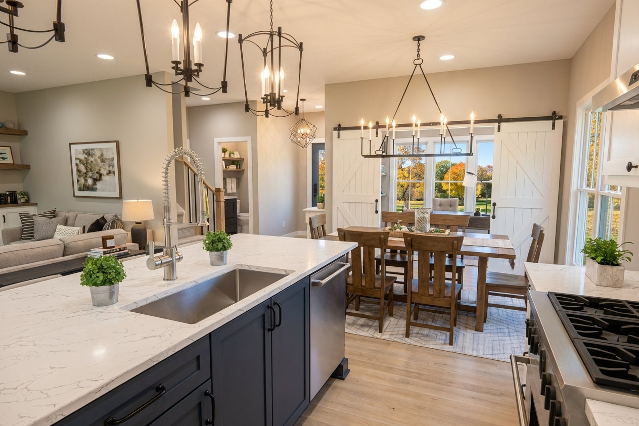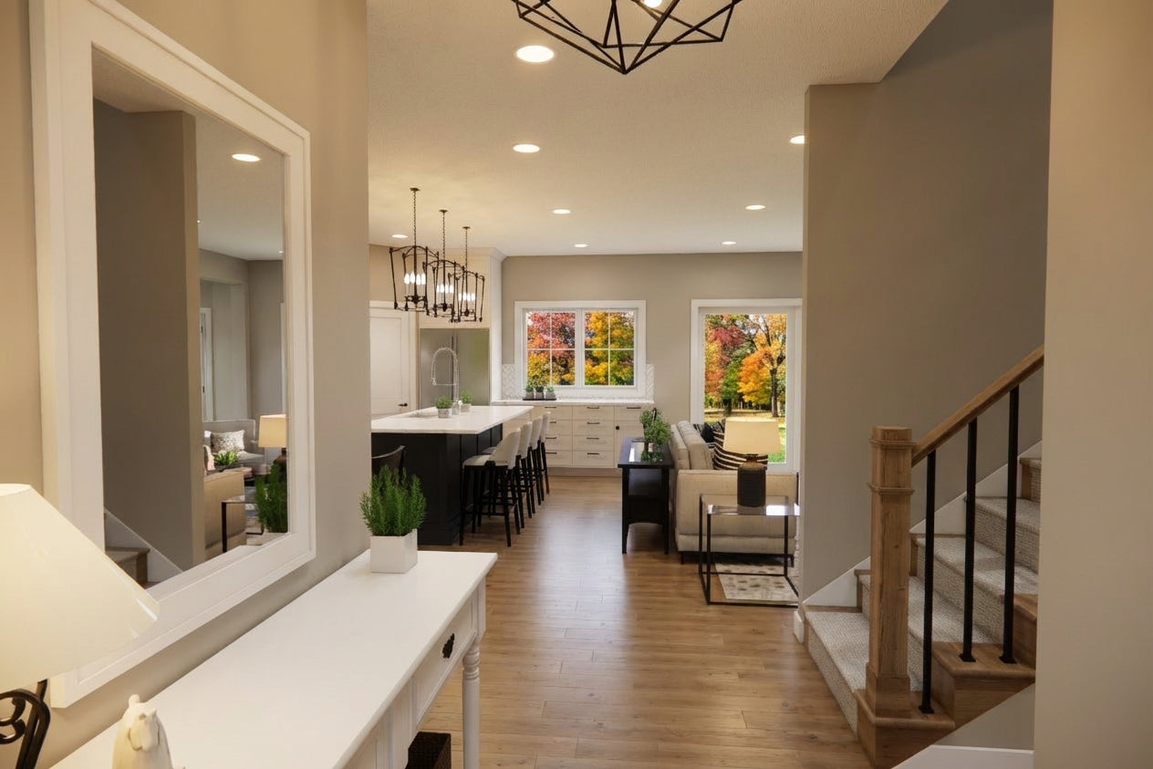 This charming Modern Farmhouse offers 2,126 square feet of thoughtfully designed living space, blending timeless curb appeal with a functional two-story layout. The exterior makes a striking first impression with crisp white horizontal lap and vertical board-and-batten siding, accented by decorative gabled rooflines and a welcoming 8x20 front porch. Inside, the main level features airy 9' ceilings and an open-concept heart comprising a family room with a cozy fireplace, a dedicated dining area, and a gourmet kitchen centered around a 3'-6" x 7' island and a walk-in pantry. Practicality meets style with a private home office near the foyer and a functional laundry-mudroom transition located just off the spacious two-car garage. The main-floor primary suite serves as a serene retreat, complete with a generous walk-in closet and private bath. Upstairs, 8' ceilings crown a versatile second level that includes two additional bedrooms, a shared full bath, and an expansive loft perfect for a media room. With an abundance of dedicated mechanical storage and a rear patio for outdoor enjoyment, this home masterfully balances stylish architectural character with the everyday needs of the modern homeowner.