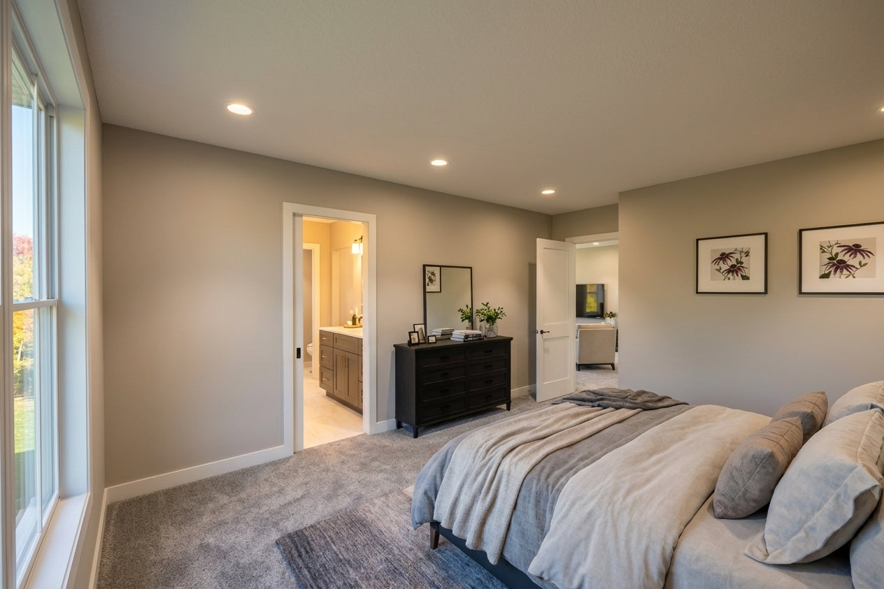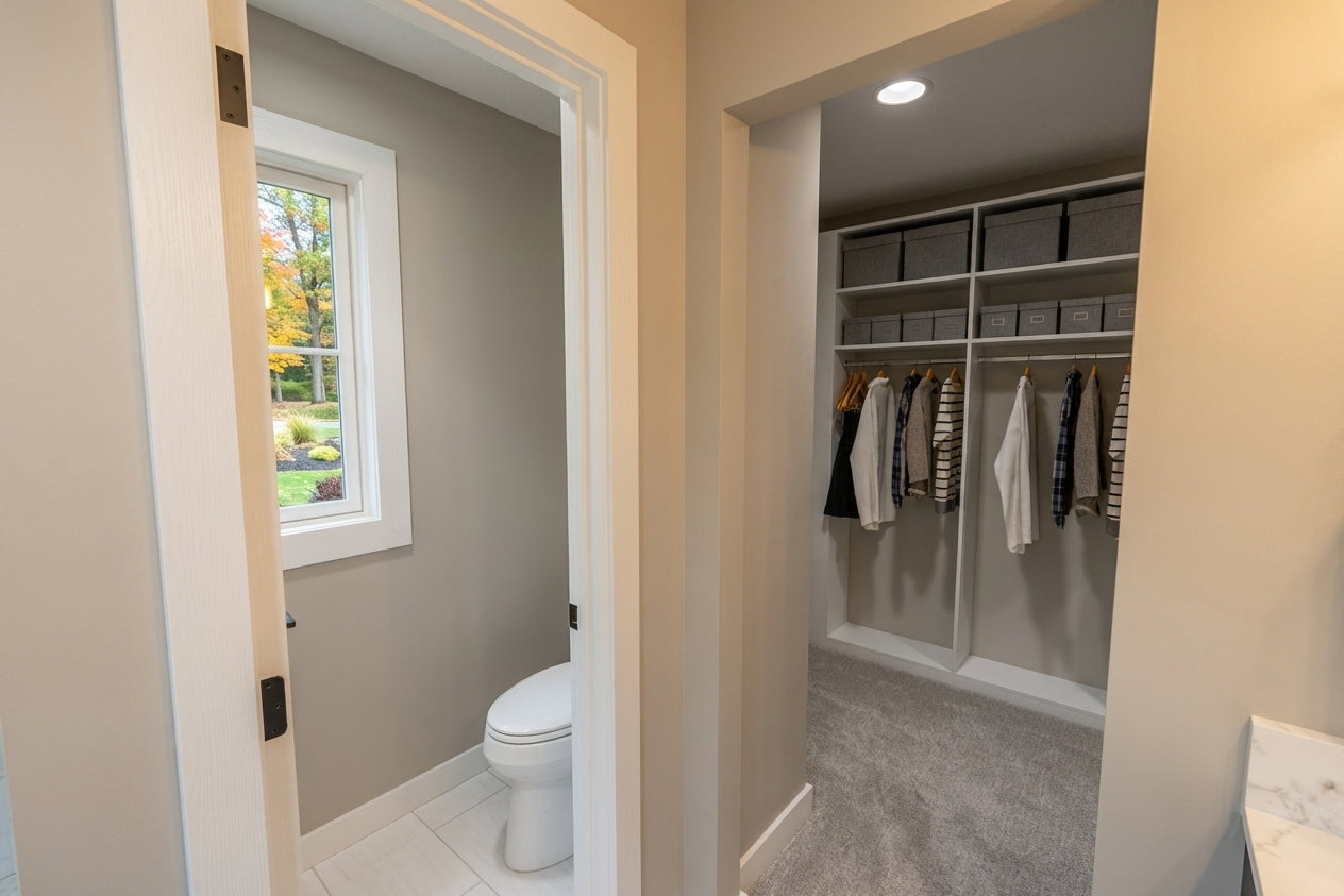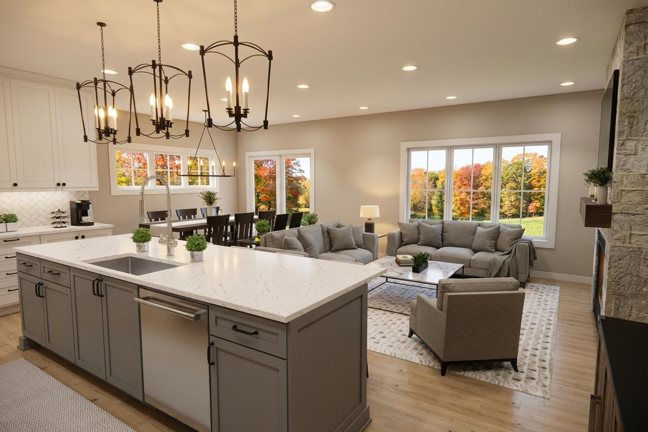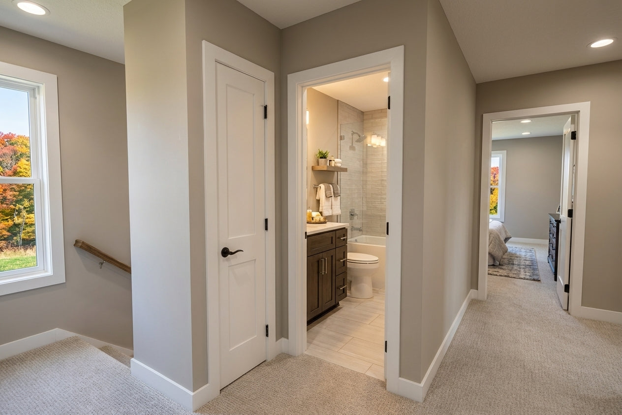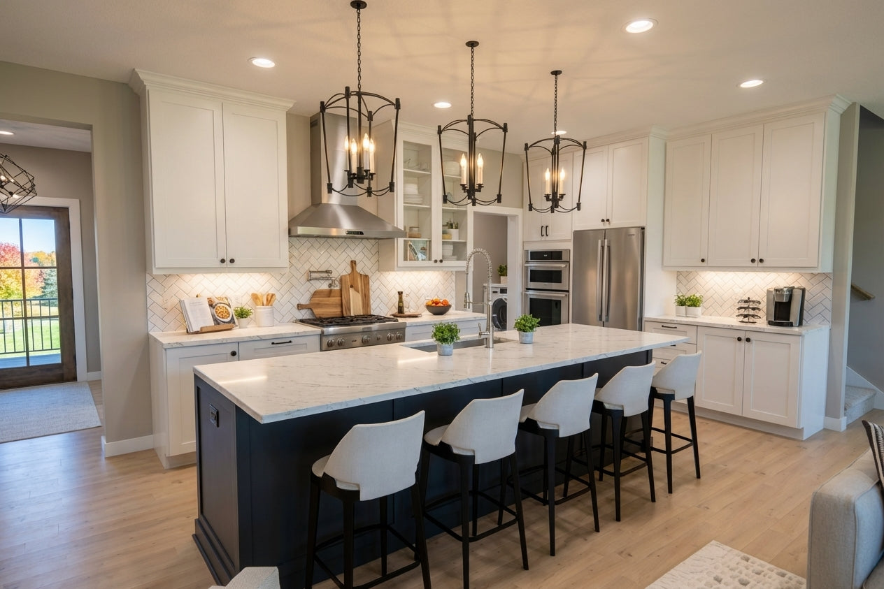 This sophisticated 1,877 sq. ft. modern farmhouse offers three bedrooms and two-and-a-half bathrooms across two well-appointed levels, perfectly blending contemporary style with everyday efficiency. The main floor features soaring 9’ ceilings and an open-concept layout where a sun-drenched great room, complete with a cozy fireplace, flows into the dining area and kitchen. Culinary enthusiasts will appreciate the gourmet kitchen's expansive 10-foot center island, ideal for both meal prep and casual seating. Just off the spacious two-car garage, a functional mudroom with laundry and a discreet powder room provide ultimate convenience. Upstairs, the second floor features 8’ ceilings and opens to a versatile central loft. The primary suite serves as a tranquil retreat with a private bath and a generous walk-in closet, while two additional bedrooms share a full hall bath. Outside, the home captivates with timeless curb appeal, showcasing crisp white lap and vertical siding, striking black metal rooflines, and charming blue shutters. With its inviting recessed entry and clean architectural lines, this home offers a beautiful balance of modern elegance and practicality.
