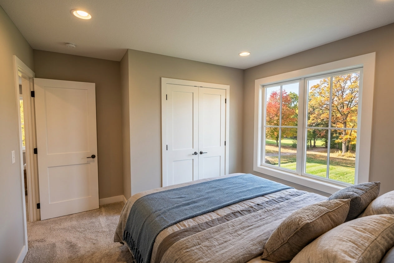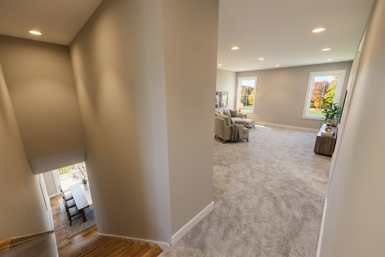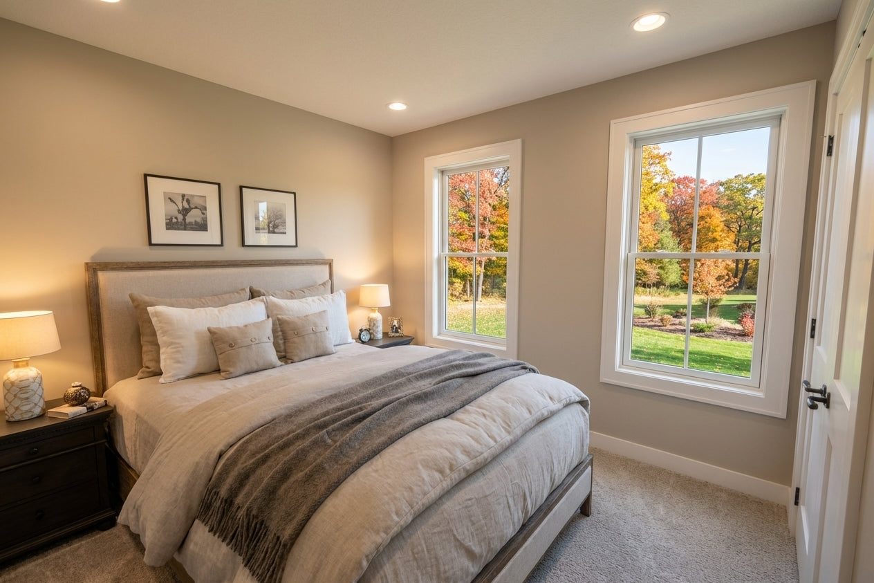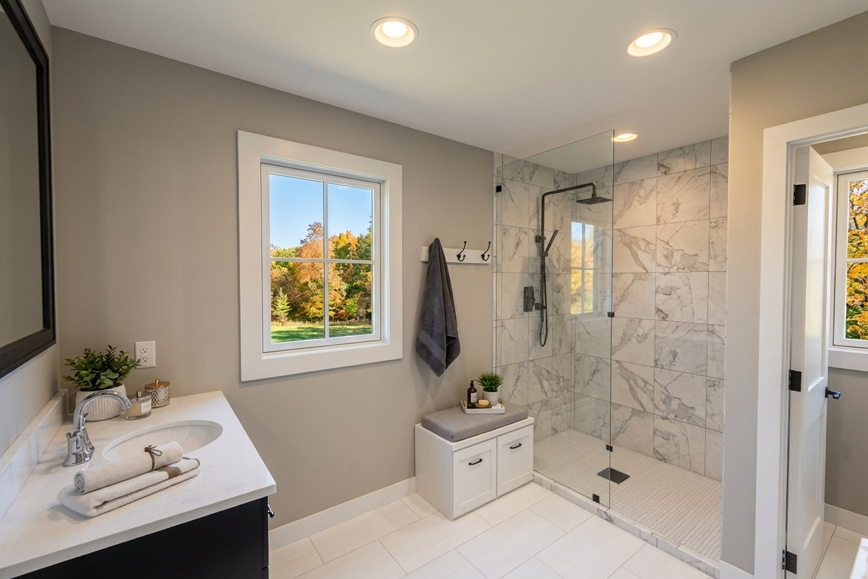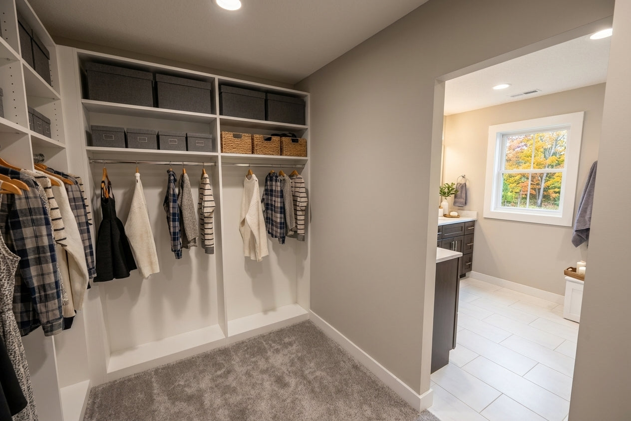 This sophisticated 1,877 sq. ft. modern farmhouse offers three bedrooms and two-and-a-half bathrooms across two well-appointed levels, perfectly blending contemporary style with everyday efficiency. The main floor features soaring 9’ ceilings and an open-concept layout where a sun-drenched great room, complete with a cozy fireplace, flows into the dining area and kitchen. Culinary enthusiasts will appreciate the gourmet kitchen's expansive 10-foot center island, ideal for both meal prep and casual seating. Just off the spacious two-car garage, a functional mudroom with laundry and a discreet powder room provide ultimate convenience. Upstairs, the second floor features 8’ ceilings and opens to a versatile central loft. The primary suite serves as a tranquil retreat with a private bath and a generous walk-in closet, while two additional bedrooms share a full hall bath. Outside, the home captivates with timeless curb appeal, showcasing crisp white lap and vertical siding, striking black metal rooflines, and charming blue shutters. With its inviting recessed entry and clean architectural lines, this home offers a beautiful balance of modern elegance and practicality.
