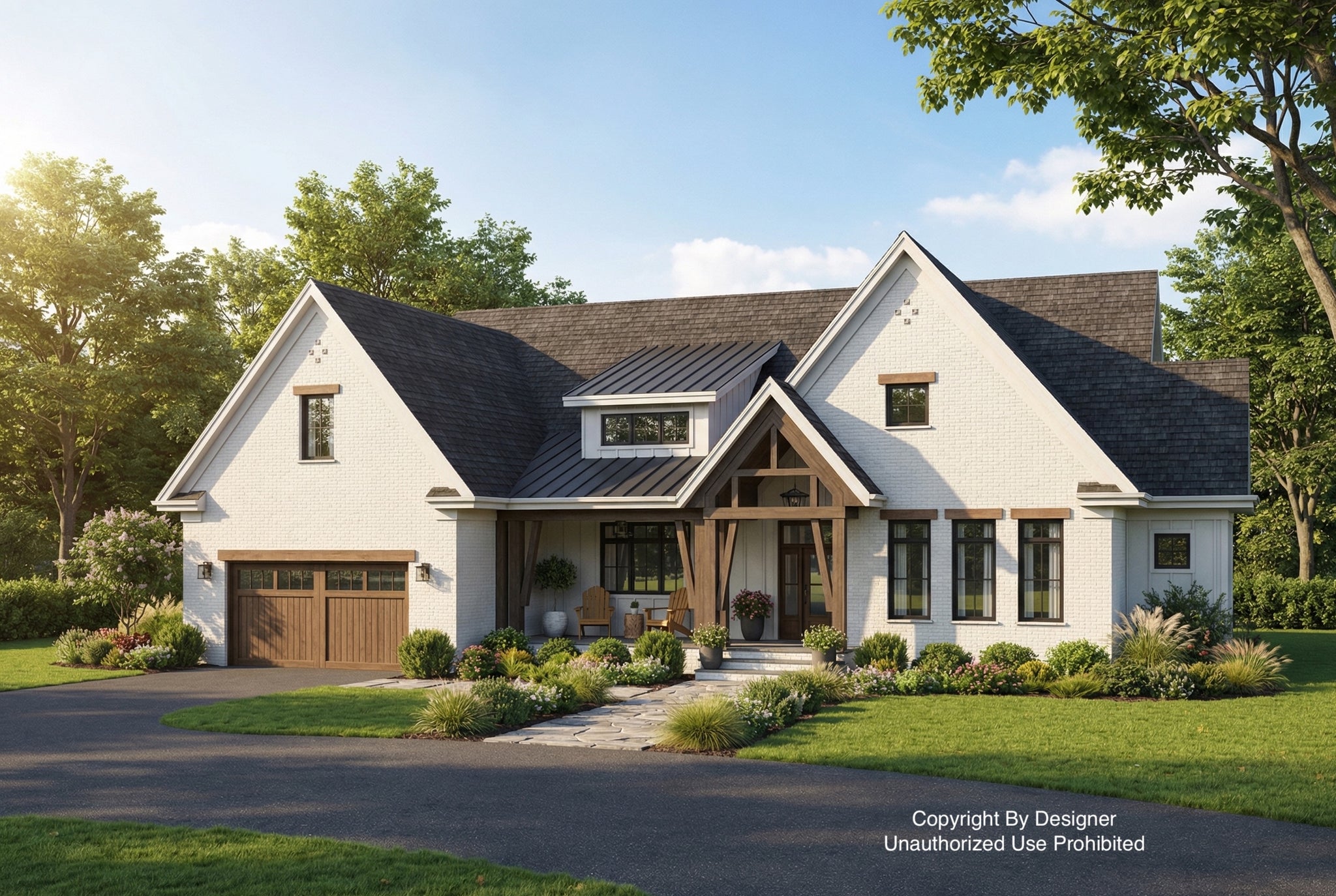 Two steeply pitched gables combined with brick and metal roof accents make this New American farmhouse a real showstopper! This one level 2336 sq ft home holds 3 bedrooms, 2 ½ baths and an optional bonus room over the garage. Multiple designs offer the option of a 2 or 3 car garage, with forward or side entry.